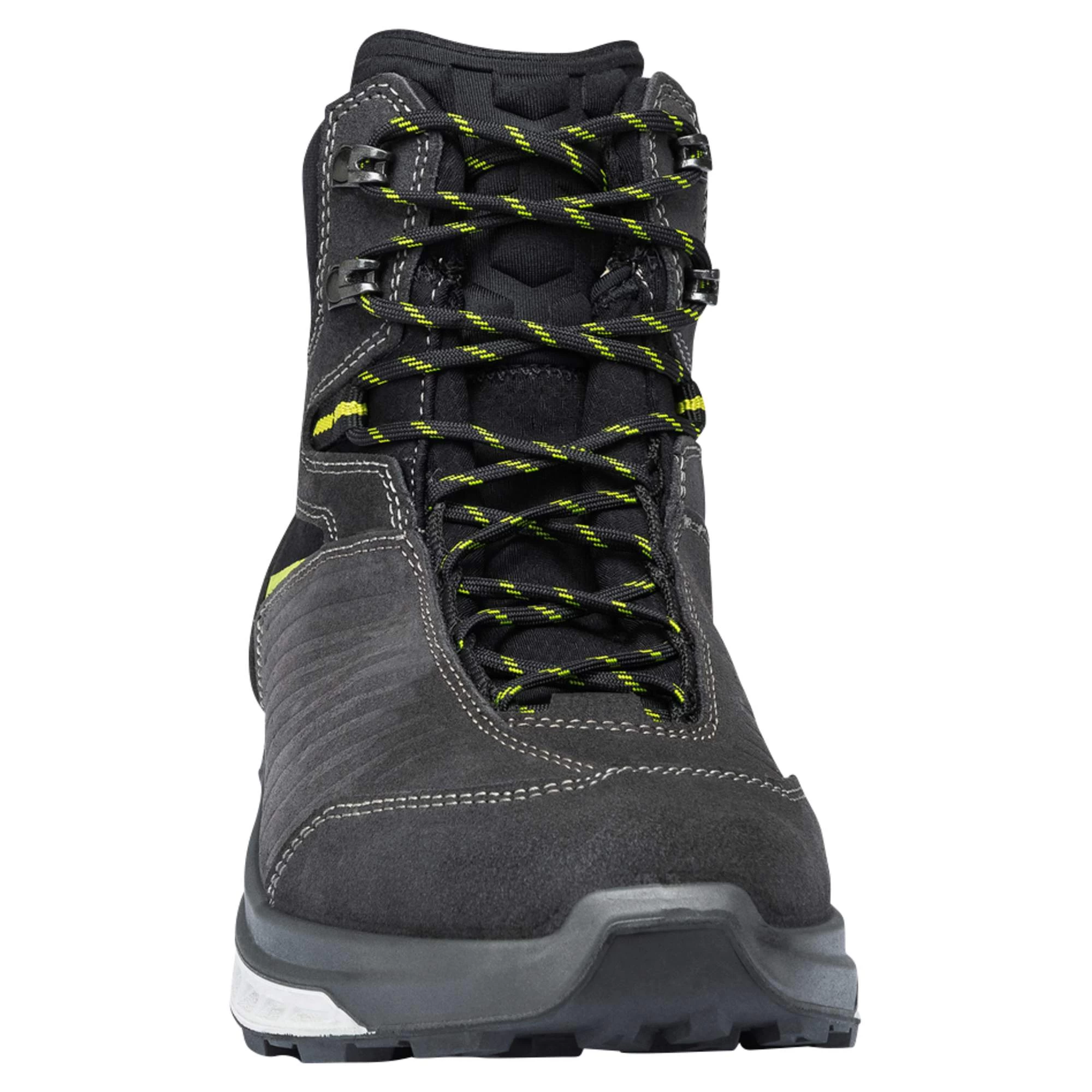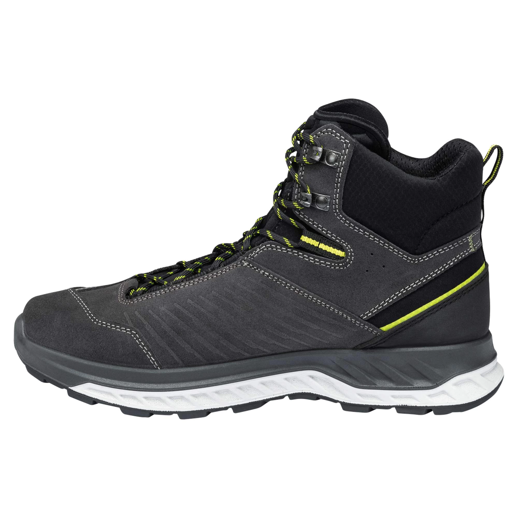 Das wirkliche Herzstück des hochfuntktionalen Stiefels erkennt man aber erst auf den zweiten Blick. Gemeint ist die Sohlenkonstruktion, die es wirklich in sich hat. Um die Abrollbewegung deines Fußes optimal unterstützen zu können, wird auf verschieden harte Dämpfungskeile zurückgegriffen. Der dunklere Teil ist weicher und umschließt deinen Fuß wie eine Art Schale für maximalen Komfort. Der hellere Teil ist härter und bietet durch seinen höhren Sohlenrand aus stabilisierendem PU zusätzlichen Halt. Dadurch wird der Auftritt gedämpft und die Abrollbewegung optimal unterstützt.