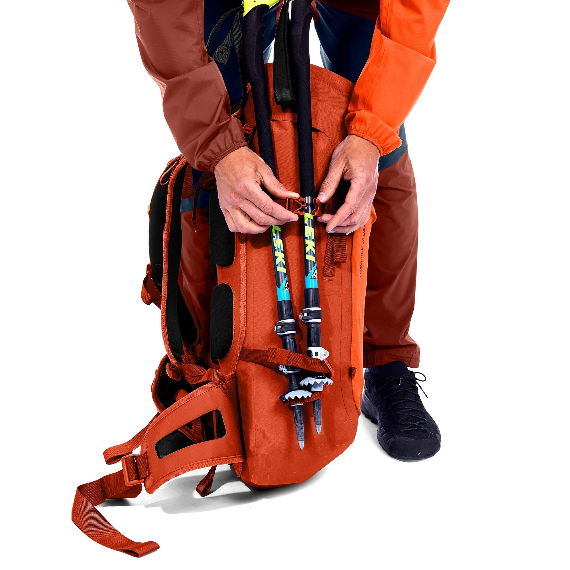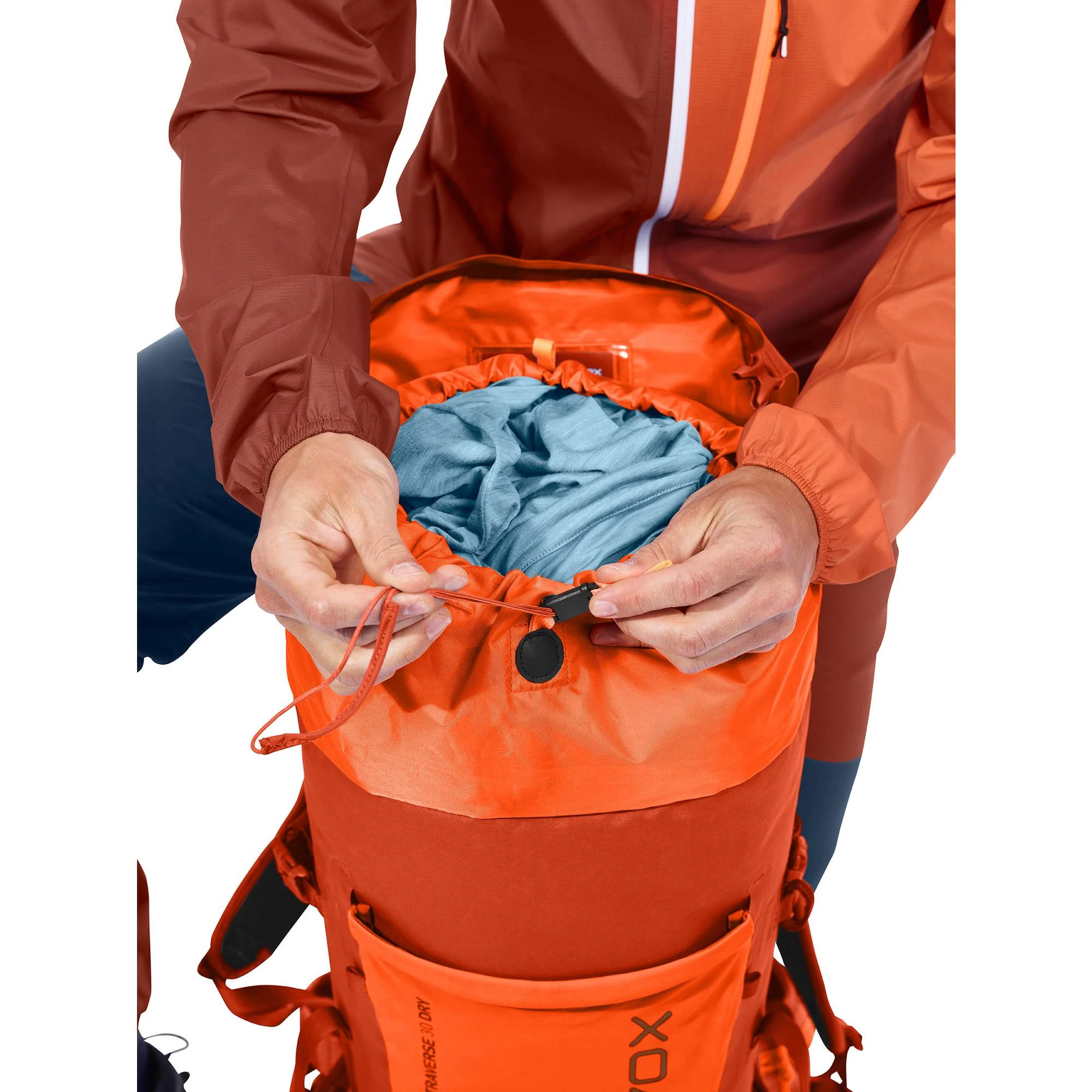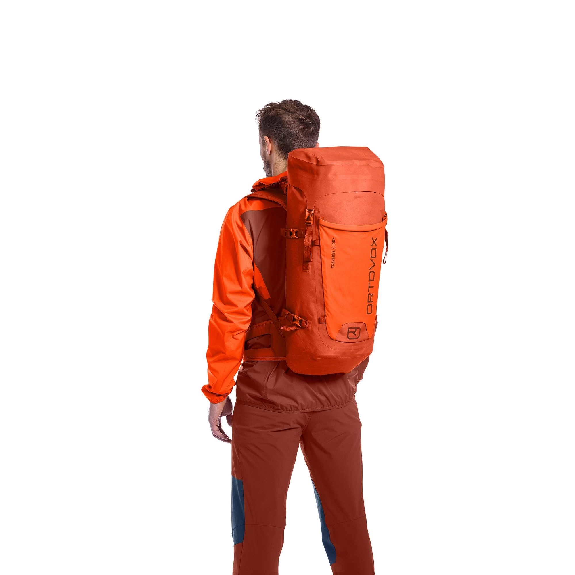 Der Traverse Dry ist Teil von Ortovox neuer und innovativer Dry Series. Die Rucksäcke dieser Serie sind extrem wasserabweisend und das ganz ohne PFC. Das wetterfeste Hauptmaterial glänzt mit einer Wassersäule von 50.000 mm und die Nähte sind Hochfrequenz verschweißt. Die RV schützen vor Sprühwasser (Schutzklasse IPX3). So kannst du auch bei Regen und Schneefall deinen Rucksack ohne Regenhülle einsetzen und hast vollen Zugriff auf die Rucksackausstattung.