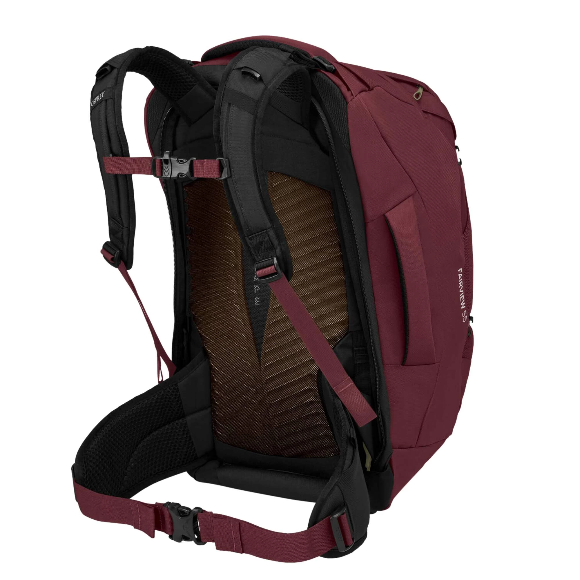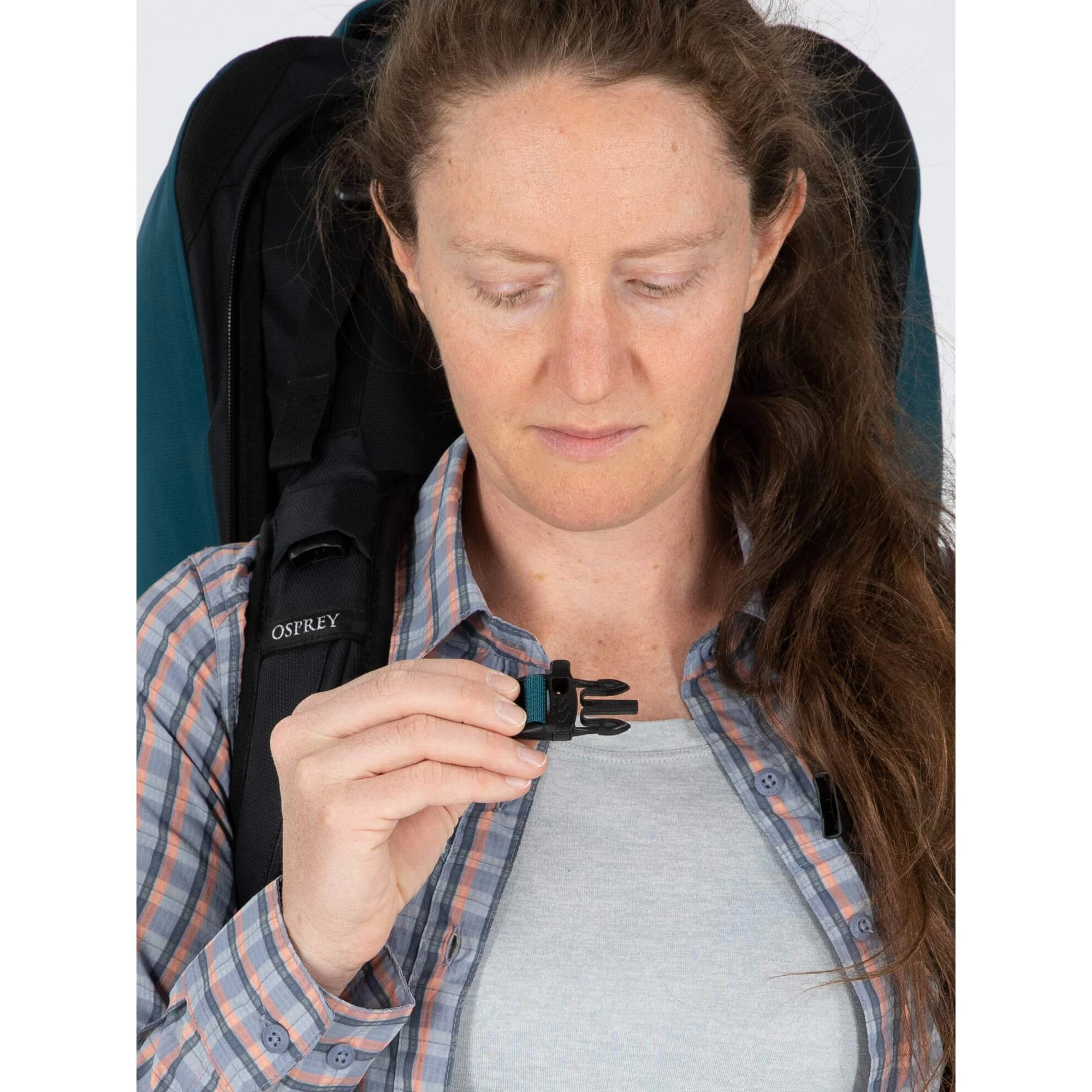 Zum Transport im Flugzeug oder Bus kannst du das komfortable Tragesystem abdecken. So verhaken sich die Gurte und Schnallen nicht mit anderen Gepäckstücken. Das Tragesystem hat einen ergonomisch geformten Hüftgurt und ist auf die weibliche Anatomie zugeschnitten – von den Schultertragegurten bis zur Rückenplatte.